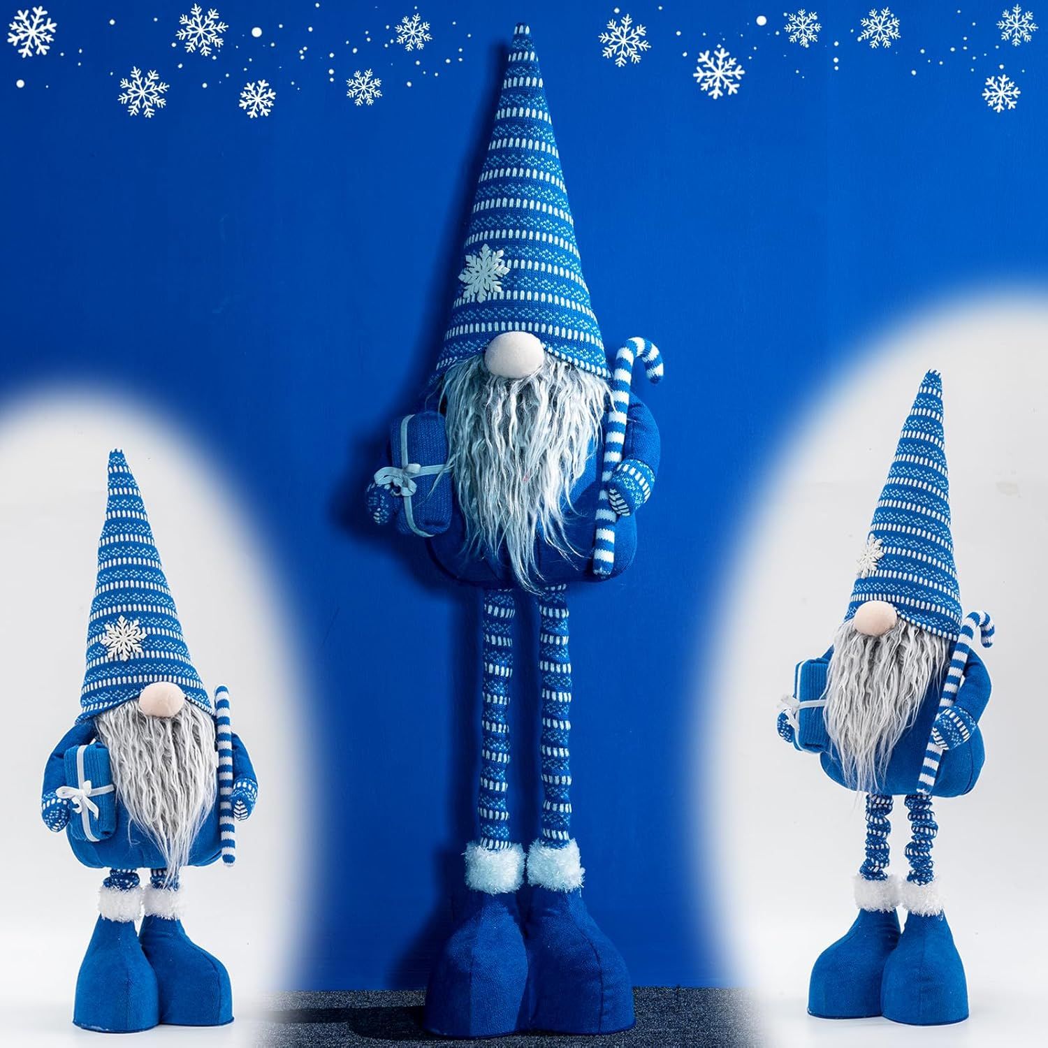 Big Retractable Spring Legs Blue Christmas Gnome Plush: Large Xmas Gnome Height adjustable 25-35inches Plush is at an adorable price, just add them to the cart, you and your family will get more fun from this Xmas elf dolls during the Christmas party favor.Classical Christmas Characters: There are many Xmas elements on our Christmas gnome, such as the hands hold the candy cane and gift box, the hat has a snowflake and the handmade striped blue exterior, it's cute and charming, we are confident that you will love them.Three Adjustable Size & Good Quality: Adjustable 25-28-35inches tall from bottom to top of the bendable hat with built-in wire, makes this christmas gnome plush look so cute, it's 100% handmade of soft and high quality material, also have long white beard and bulbous nose.Home Decor for Christmas: The big blue xmas gnome plush ornaments always defend the warmth and hope of the winter, also protect people from hungry and coldness, which will be the perfect Christmas decorations for a special place in your home, and the hit of your table decorations for office and home.Gift Choice for Christmas: This lovely plush gnome represents happiness and hope, will not only bring good luck to your family, but also the courage to fight against difficulties. Perfect gift for Birthdays, Thanksgiving, Christmas holidays, and New Year decorations.