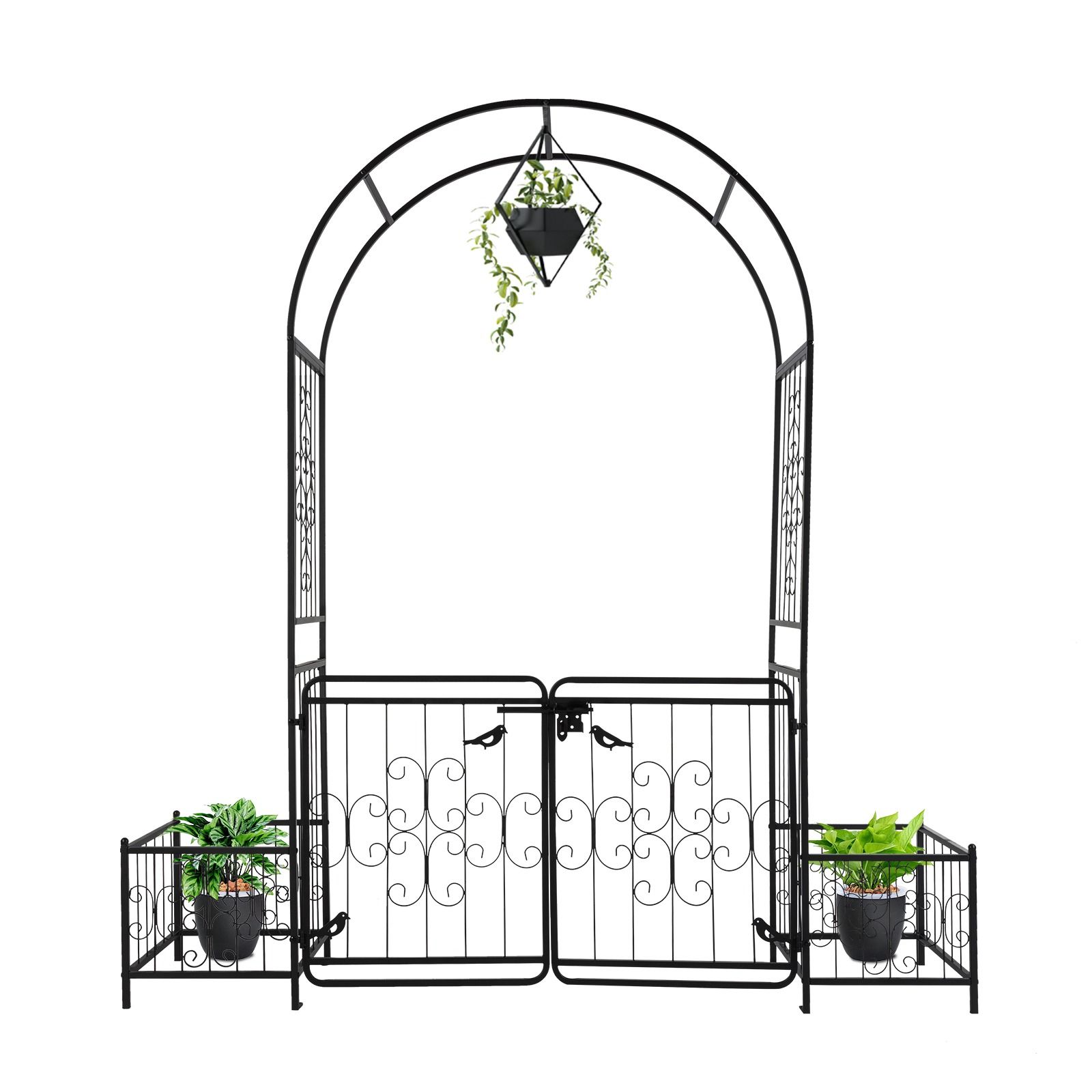 Create a charming focal point in your outdoor space with this 7.2ft Black Iron Garden Arch with Gate and Planter Boxes. Featuring a graceful arched top and classic trellis sides, this arbor is ideal for supporting climbing plants like roses, ivy, or wisteria, while adding height and beauty to gardens, pathways, or patios.