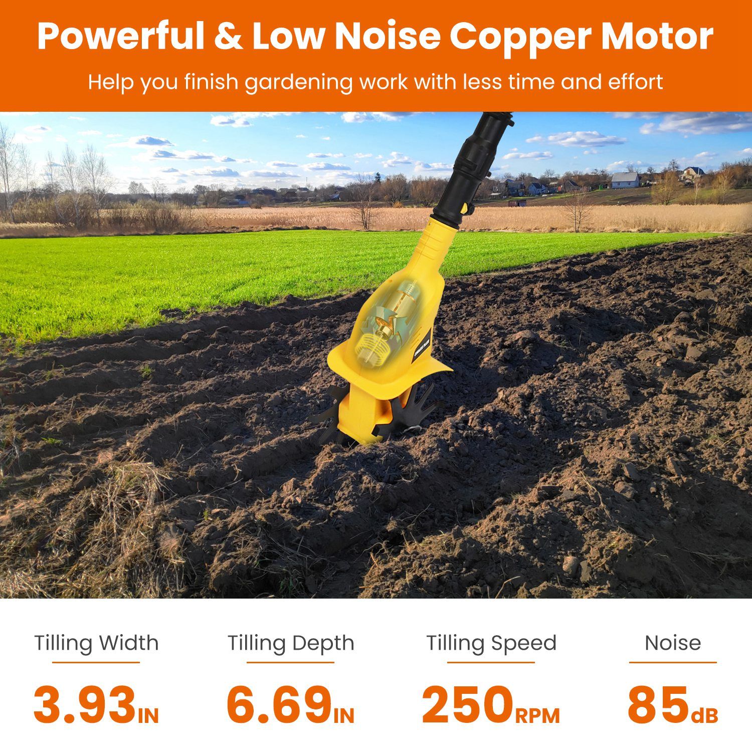 *Powerful & Low Noise Motor*:Featured with powerful copper motor with about 85dB low noise,this handheld rotary garden cultivator delivers up to 250rpm speed,helping horticulturists complete various gardening works through any hard or clay-like soil with higher efficiency but less time and effort. What’s more,especially designed with double-layer safety system to protect your safety,this tiller cultivator won’t start working until you release the safety button and power trigger at the same time.