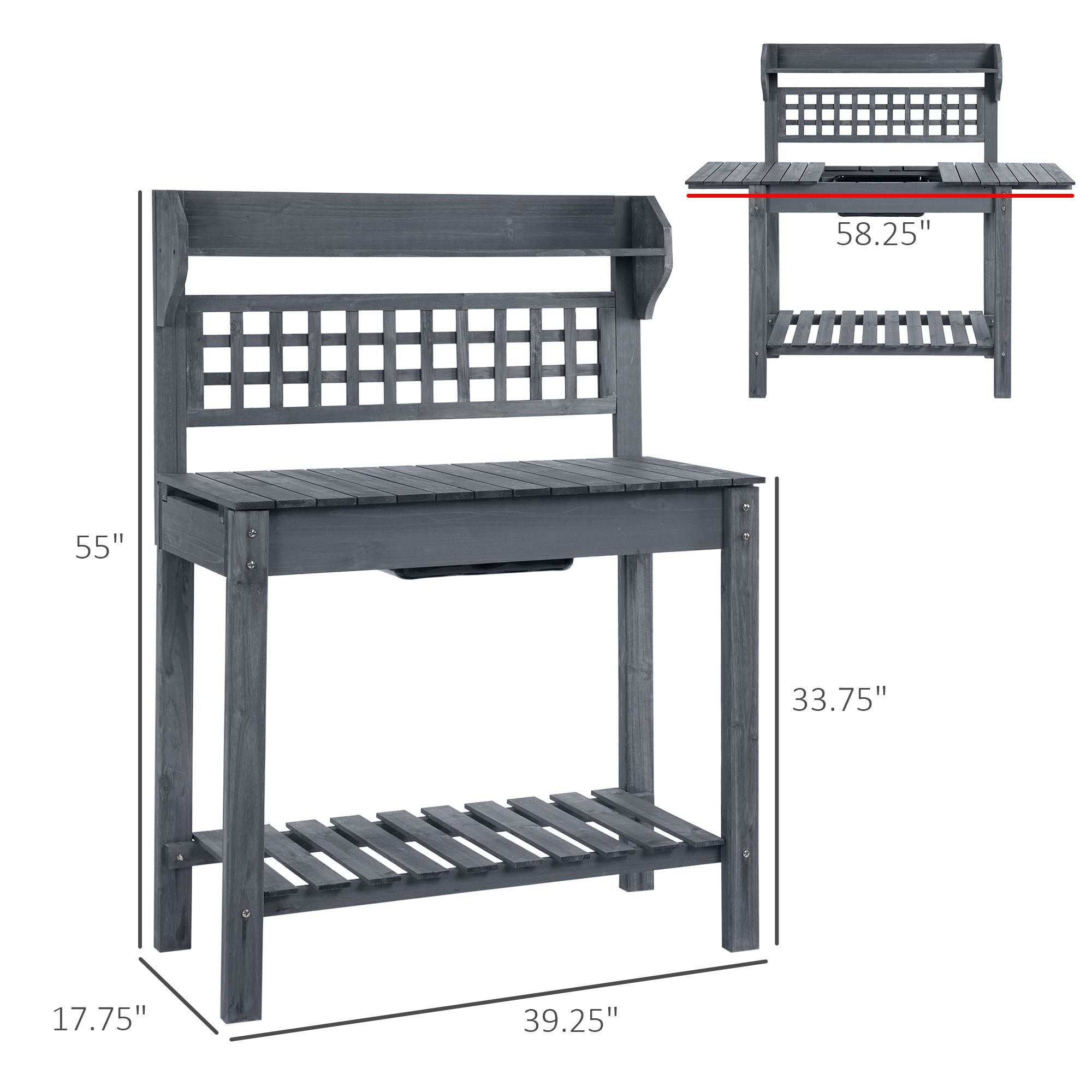 5.- Outdoor Potting Bench Dimensions: Overall Dimensions: 39.25''L x 17.75''W x 55''H, Weight Capacity: 176 lbs (countertop), 55 lbs (clapboard)..